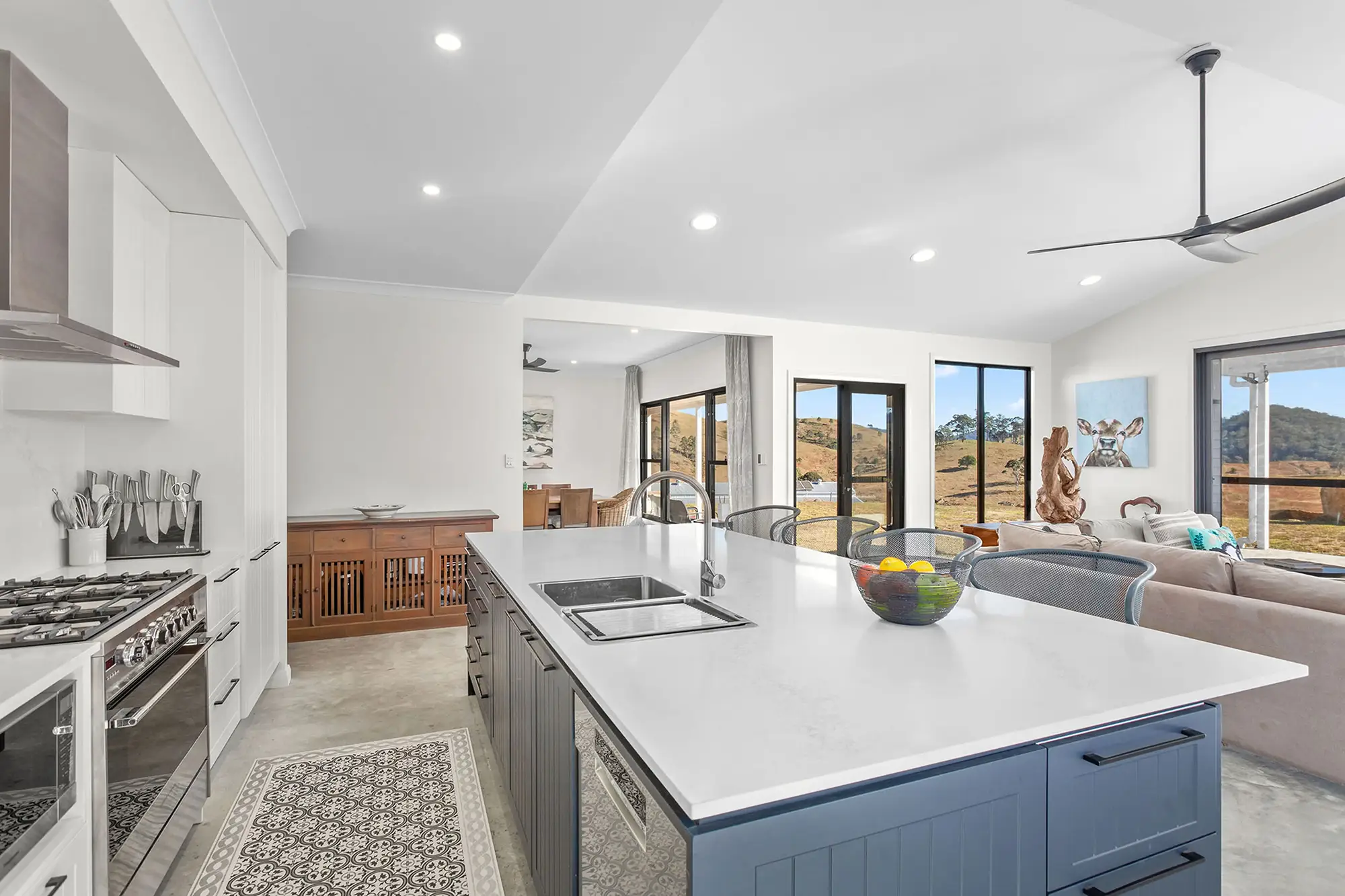 The couple worked with Michael to modify the Berrima design, adding a bunkroom, as well as carport and alfresco out the back. Plus, they altered the layout to make the most of the magnificent scenery. “Every room along from the carport has a view,” says Greg. “We elongated the design to encompass that.