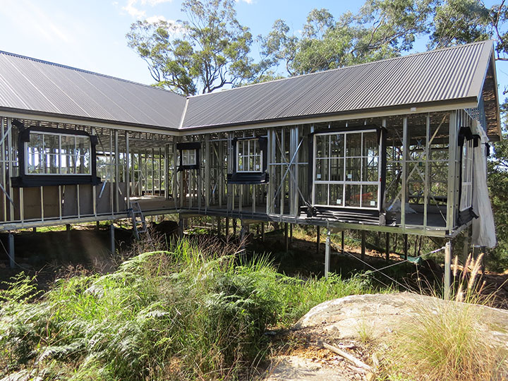 It was a sloping bush-block, so she chose a steel floor raised three metres at the front and 400 mm at the rear. The concreter set the posts, but she fitted the bearers and joists herself and laid the particleboard flooring.